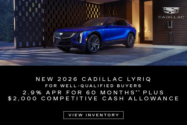 *^ 2026 CADILLAC LYRIQ. 2.9% APR for 60 months for well-qualified buyers when financed w/Cadillac Financial. Monthly payment is $17.92 for every $1000 you finance. Average down payment is 14.7%. Some customers will not qualify. $2,000 Competitive Cash available for qualified customers. Offers may be combined where applicable. Plus tax, title, license, and dealer fees. Must show proof of current ownership or lease of a 2012 model year or newer select non-GM vehicle at least 30 days prior to the new vehicle sale. Take new retail delivery by 04-30-2026.